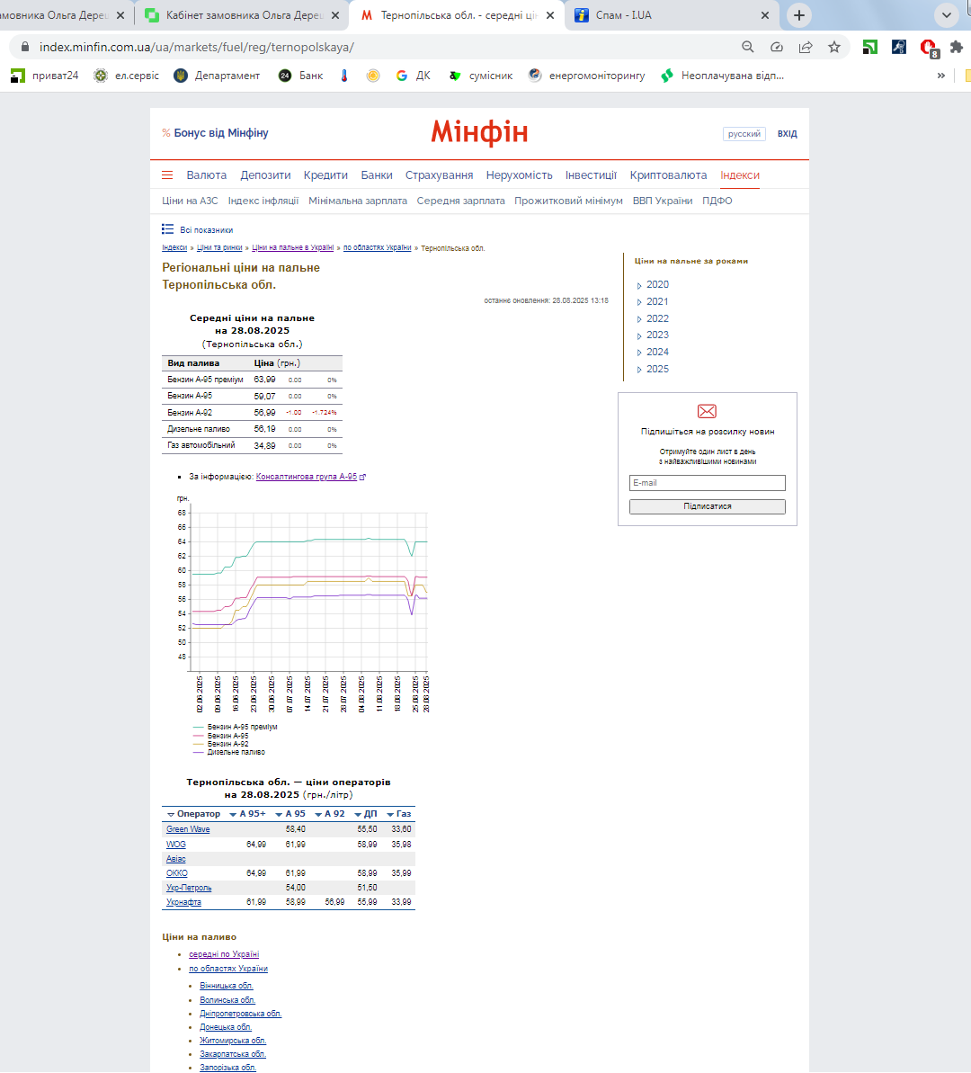 Очікувана вартість та обґрунтування очікуваної вартості предмета закупівлі: 168 000,00 грн. Визначення очікуваної вартості предмета закупівлі обумовлене статистичним аналізом про середньомісячне використання паливно-мастильних матеріалів на потреби замовника за попередній аналогічний період та згідно з діючими ринковими цінами, отриманими від потенційних постачальників комерційних пропозицій